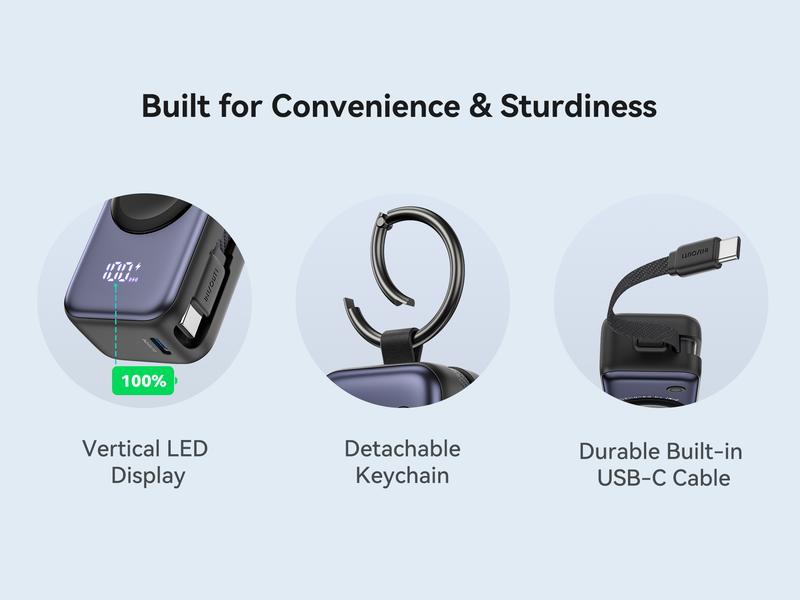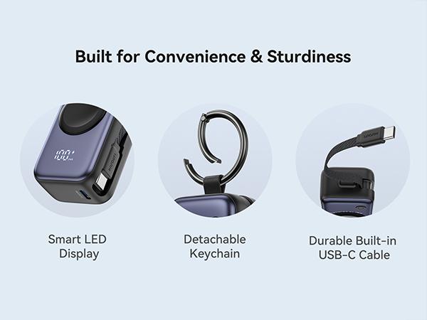 INIU Snapgo Mini 5000Mah Portable Charger with Built-In Cables Keychain 20W PD Fast Charging Lightweight LED Display Power Bank for Apple Watch Ultra SE 2/3 Series Iphone Air 8 ~ 17 Airpods Series Travel Battery Pack USB Type-C Phone Charger Perfect Gift