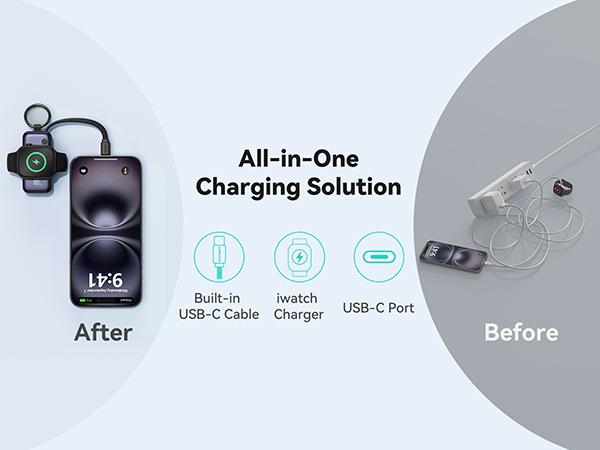 - Multi-Device Charging: Equipped with a built-in USB-C cable and an additional USB-C port, this portable power bank powers your iPhone, iwatch, and AirPods simultaneously—without the hassle of carrying multiple chargers.